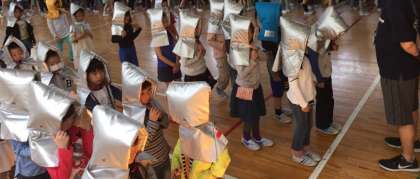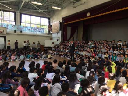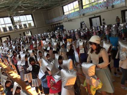 地震を想定して、体育館に避難しました。1年生はその様子を見学しました。とても静かに避難することができました。