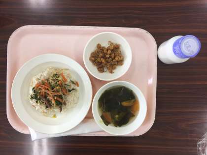 今日はビビンパ、わかめスープ、大豆とじゃこの甘辛揚げ、牛乳です。
