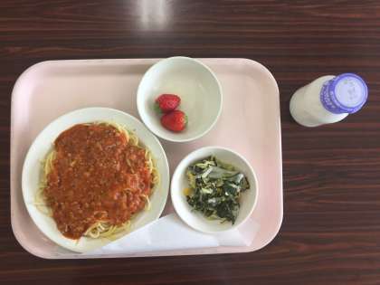 今日は、スパゲティミートソース、ほうれん草とキャベツのサラダ、いちご、牛乳です。
