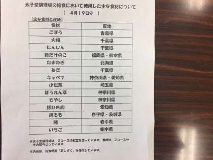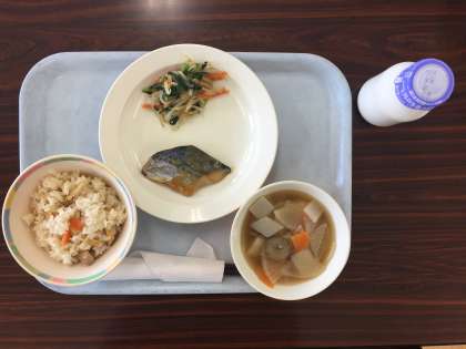 今日は、和食です。たけのこごはん、鰆の西京焼き、けんちん汁、おひたし、牛乳です。