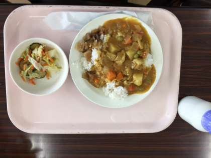 献立はカレーライス、牛乳、福神漬、フレンチサラダです。今日のカレーライスはとても美味しいです。太子堂調理場の方に向かって大声でうまい!と叫びたいところです。叫ばなくても、配膳員の方々に伝えれば大丈夫と栄養士の先生に教えていただきました。これで今日の夕ご飯がカレーなら最高なのですが。