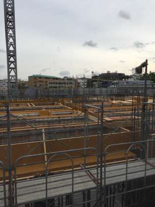 第一仮設の三階から見た工事現場の様子です。いよいよ新校舎の方も高さが三階に近づいてきました。二階に関しては陽当たりと音は我慢する日々が続きます。