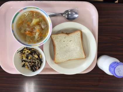 献立は、ツナトーストサンド、牛乳、ウインナーとキャベツのスープ、満点サラダです。今日のサラダのネーミングは面白い。栄養のバランスが満点ということなのでしょうか。ひじきを煮物や混ぜご飯以外で食べるのは新鮮に感じます。
