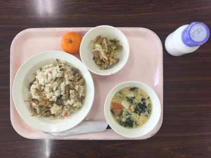今日は、五目炊き込みご飯、かき玉汁、白菜のおかか和え、冷凍みかん、牛乳です。