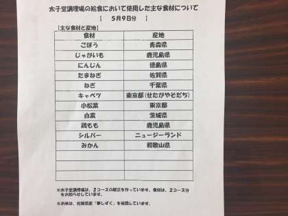 食材表に、「せたがやそだち」のキャベツがあり、今日は「せたがやそだち」が食べられる、と思いましたが、残念ながらキャベツは、昨日のスープの食材だったようで、今日の食材にはありませんでした。昨日のキャベツは神奈川県産でした。「せたがやそだち」は、大量確保が難しいのでしょうね。