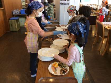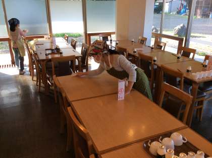 朝食の準備中です。食事係がよく働いています。