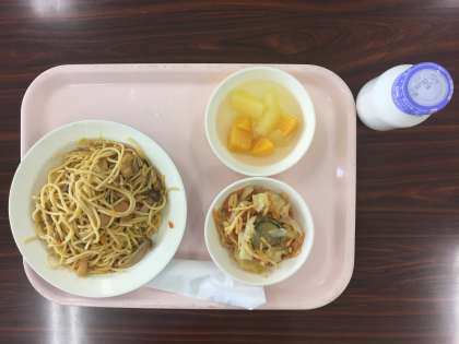 今日は和風スパゲッテイ、じゃがいものパリパリサラダ、ミックスフルーツ、牛乳です。