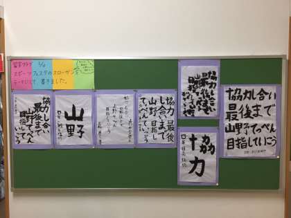 スポーツフェスタのスローガンを習字クラブの皆さんが書きました。いよいよあと一週間です。