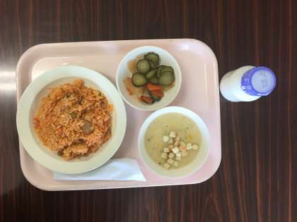 今日は、チキンライス、コーンポタージュ、シャキシャキ野菜、牛乳です。