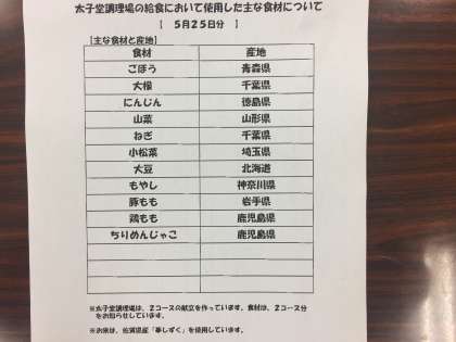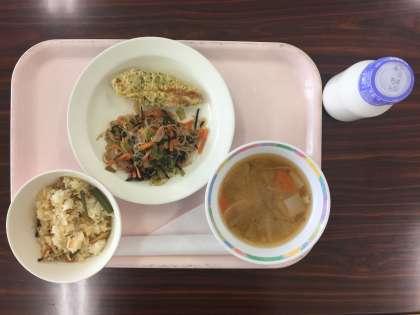 今日は、山菜おこわ、笹かまぼこの天ぷら、豚汁、小松菜サラダ、牛乳です。