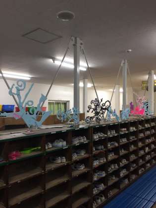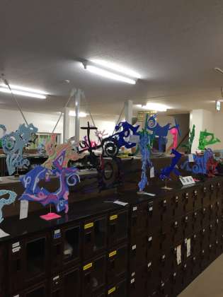 第一仮設の一階玄関の靴箱上に5年生の図工の作品が展示されています。今後はどうなるのでしょうか? さて、今日はあいにくの雨です。明日の準備のためにも、なるべく早く上がってほしいのですが。