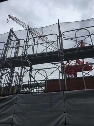 第一仮設三階の廊下から撮影した東校舎の工事の様子です。4階部分の工事が進んでいます。