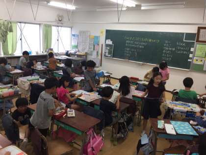 楽しかったスポーツフェスタを絵でかこう。クレヨンで描いた絵の上から水彩絵の具で着色していきます。
