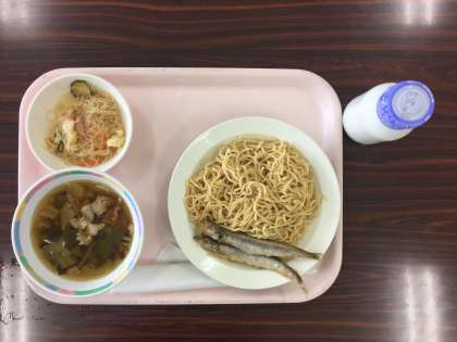 今日は、つけ醤油ラーメン、ししゃものから揚げ、春雨サラダ、牛乳です。