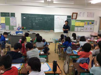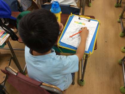 3年生が町探検から戻ってきました。学習のまとめをしています。