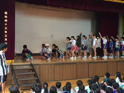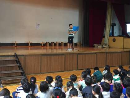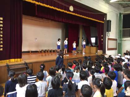 今日はプール開きを行いました。いつものように6年生の挨拶から始まり、運動委員会によるバディの仕方の演示に続いて、6年の代表による決意の言葉がありました。