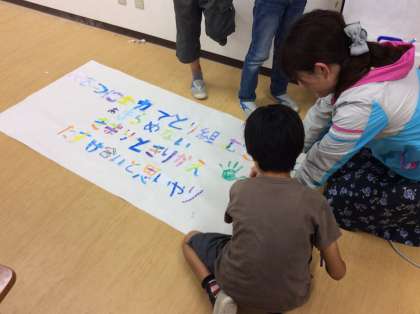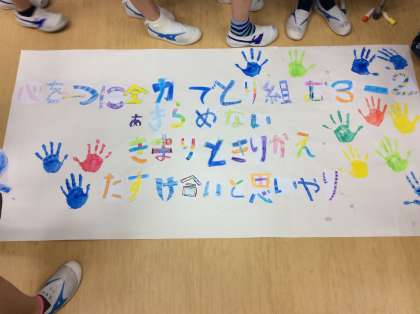写真は、3年2組の学級目標づくりの様子です。一人一人の手形が、とても素敵です。