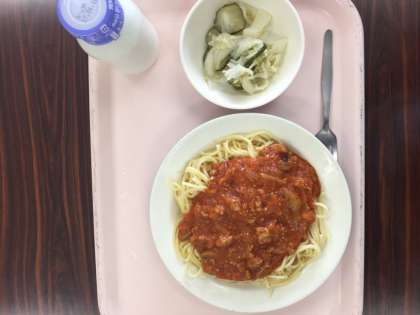 献立は、スパゲッティミートソース、牛乳、オニオンサラダです。検食の量がはんぱなく多いです。まるで大学の学食のようです。私事ですが、通っていた大学の学食で二番目に安いメニューがミートソースでした。一番安かったのはきつねうどんでした。何でこんなことを覚えているか、お分かりですよね。写真の向きがおかしくなってしまいました。ごめんなさい!