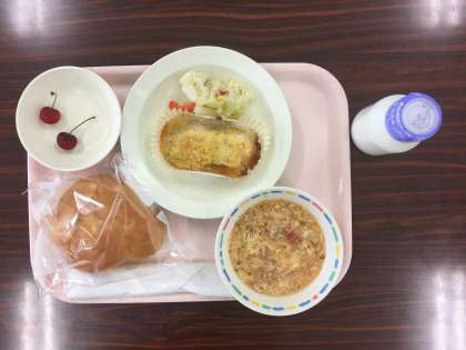 今日は、パインパン、魚のパン粉焼き、キャベツとパプリカのサラダ、卵とトマトのスープ、さくらんぼ、牛乳です。