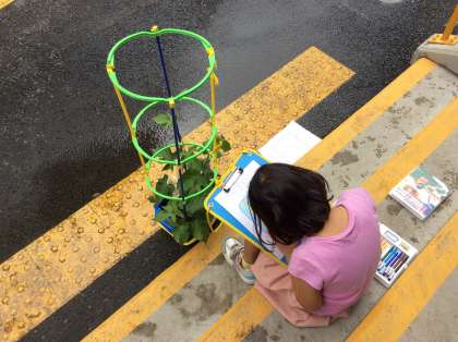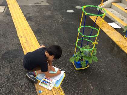 大事に育てているあさがおを、しっかり観察しています。