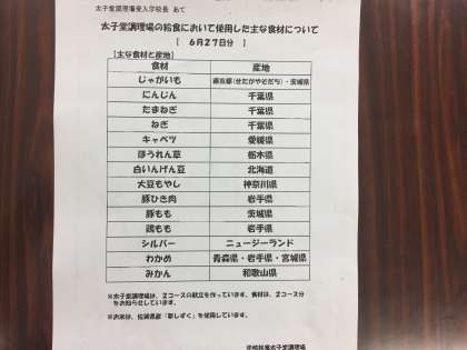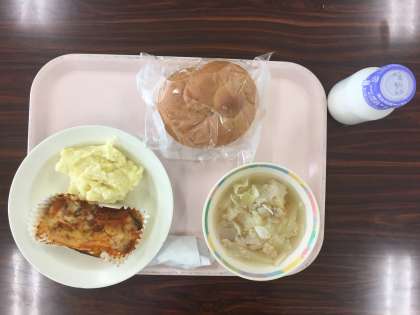 今日は、セサミパン、魚のピザ焼き、クリームポテト、田舎風豆スープ、牛乳です。