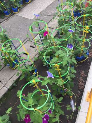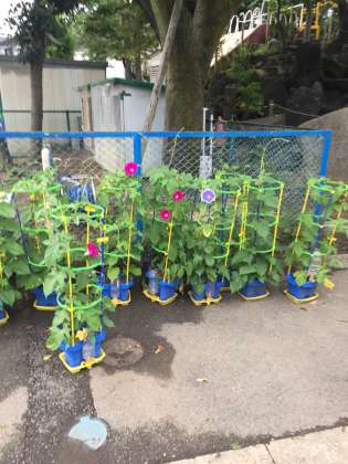 1年生が育てているあさがおです。もう、花が咲き始めています。