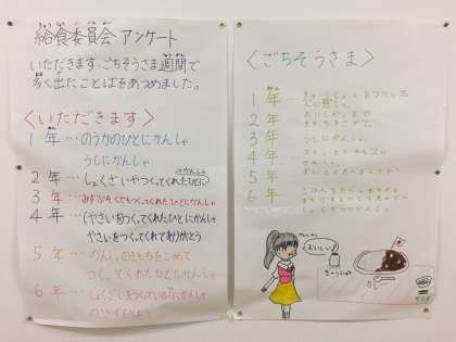 給食委員会が、いただきます、ごちそうさま週間で、誰に感謝して食べるかを各学年から集めて、掲示しています。