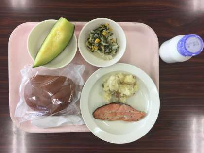 今日は、ココアパン、鮭のハーブ焼き、ほうれん草とキャベツのサラダ、ジャーマンポテト、メロン、牛乳です。