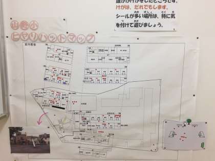保健室前からです。校内のどんな場所でケガが発生しているかを図面で表したものです。教室内が多いのが、気になります。