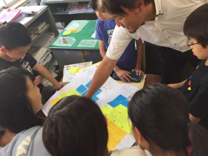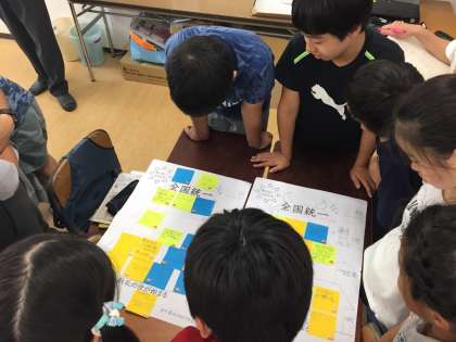 班ごとに整理した台紙を見せ合い、説明したり、質問したりします。