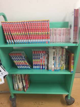 今朝は6年生教室前の廊下からです。これはブックトラックと言います。学習に関係ある本を図書事務の方が集めて、子どもたちがいつでも手に取れるようにしてくださっています。歴史の学習まんがは人気があります。