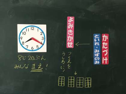 1年生の教室からです。火曜日の朝は、職員朝会があるので、子どもたちは、黒板に書かれている先生の指示を守って行動します。入学からまもなく四カ月。しっかりと行動できます。