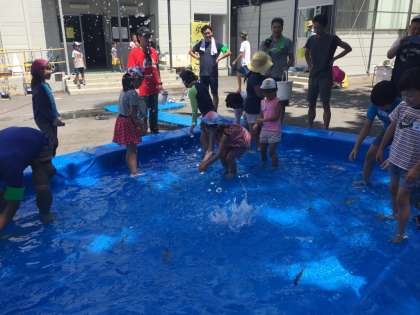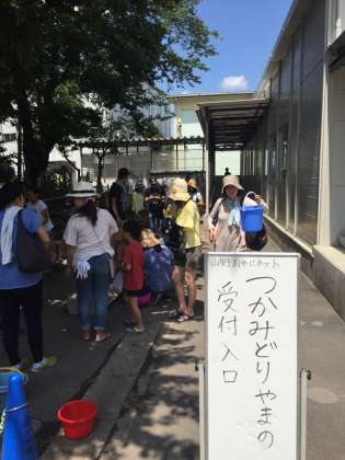 おやじネット主催の渾身の企画、つりぼり山野が装いも新たに復活。今回は簡易プールにマスとヤマメを放して、つかみどりをしました。