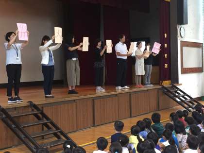 元気に校歌を歌って、終業式を終えました。続いて体操で優秀な成績をおさめた児童の表彰がありました。生活指導部の先生から夏休みの生活についてのお話がありました。