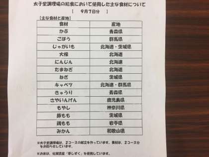 でも、今日の食材表で、久々に復活したものがあります。じゃがいもの産地に茨城県と併記して北海道と書いてありました。今日のけんちん汁に入っていたのは里芋でしたけどね。