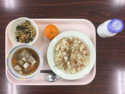 今日は、五目寿司、けんちん汁、ごまドレサラダ、冷凍みかん、牛乳です。