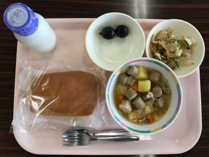 今日の献立は、大豆チーズパン、ポトフ、ツナサラダ、巨峰、牛乳です。ポトフはポトフーとも言い、意味は、火にかけた鍋。フランスの家庭料理の一つです。世界の各国に似た料理があるようで、ドイツには、アイントプフ、中国には火鍋という料理があるのだとか。フランス版のウィキペディアには、日本版ポトフとして、おでんが挙げられているそうです。今日は晴れて暑くなりましたが、寒い冬にはうれしい料理ですね。