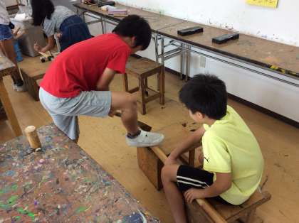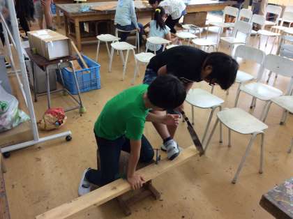 図工の時間です。エコバードを作成します。まずは、のこぎりで木を切るところから