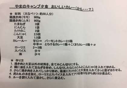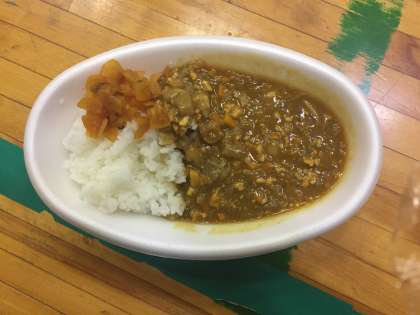ご飯はアルファ米、カレーの具は、挽肉、タマネギ、ニンジン、コンニャク、タケノコ、大豆です。辛さは甘口と辛口の2種類。私は中辛を食べましたが、お母様方の愛情がたっぷり入っていたようで、中辛でもとても甘かったです。