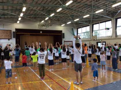 ラジオ体操の時間です。指導は、2年3組担任の井上先生です。
