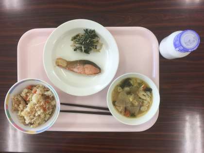 今日は秋の香りごはん、鮭の西京焼き、ほうれん草のごま和え、のっぺい汁、牛乳です。