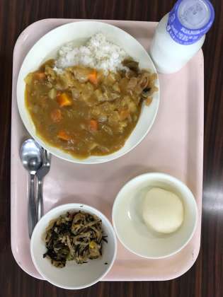 献立はカレーライス、福神漬け、大根とひじきのサラダ、梨、牛乳です。写真の向きが縦になってしまいました。ごめんなさい。先日の三峯神社のお祭りで、人生初のお神輿を担ぎました。そのために鯉口のシャツとタボシャツをお願いして買ってきてもらったのですが、サイズ表示を見て、思わずのけぞってしまいました。普通の服なら、Lとか2Lなのですが、タグに書かれていたのはなんと「肥満」。ちなみにその上は「超肥満」だそうです。本当に「肥満」になりそうなので、今日のカレーはおいしかったけれど、おかわりはやめておきました。