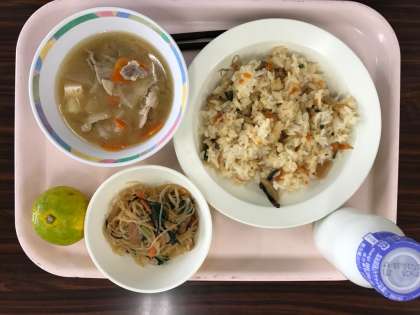献立は、山菜おこわ、豚汁、小松菜と春雨のサラダ、みかん、牛乳です。今日の豚汁にはねぎが入っています。産地は福島県か世田谷区です。さあ、どちらでしょうか? 福島県と言えば、前任校で一緒に仕事をしていた先生が、震災直後に福島県ではなく、特別に東京都の教員として採用された方でした。5年間の任期を終え、今年の4月から福島市内の小学校に勤務されてています。I先生、お元気ですか?