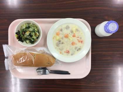 今日は、ぶどうパン、クリームシチュー、海藻サラダキャロットドレッシング、牛乳です。