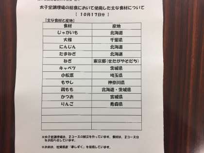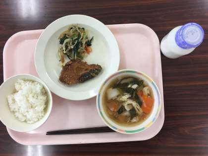 今日は、ごはん、かつおのあずま煮、のっぺい汁、おひたし、牛乳です。