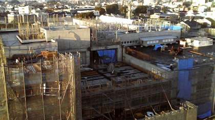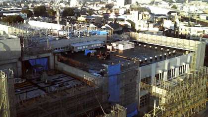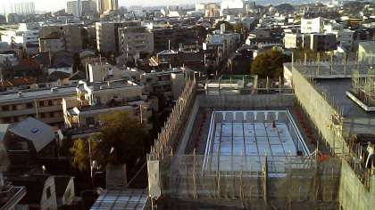 大井さんのドローンによる工事現場の写真です。ガラス窓が入っているのは体育館部分だそうです。