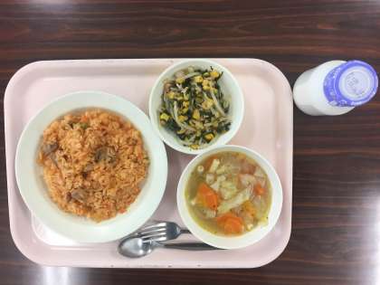 今日は、チキンライス、マカロニスープ、ほうれん草サラダ、牛乳です。