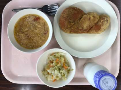 献立はきな粉揚げパン、卵とトマトのスープ、りんごサラダ、牛乳です。給食メニューの王道、揚げパンです。先日、とあるパン屋さんの店先に揚げパンが売られていました。一個130円。これは微妙な価格ですね。手間を考えるとこのぐらいはかかるのでしょうか? 担任時代、揚げパンが出ると、きな粉だけをお代わりする子が何人もいたことを思い出します。今日もおいしくいただきました。