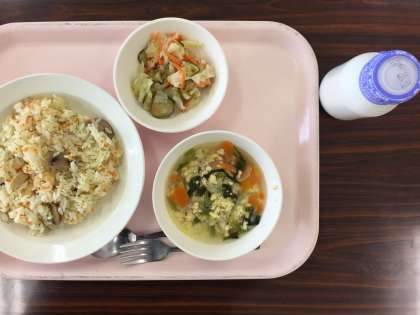 今日は、エビピラフ、イタリアンスープ、フレンチサラダ、牛乳です。