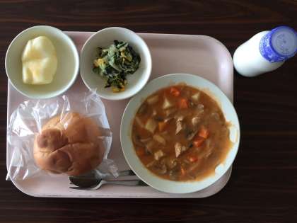 今日は、ミルクパン、ポークときのこのシチュー、ほうれん草とキャベツのサラダ、りんご、牛乳です。